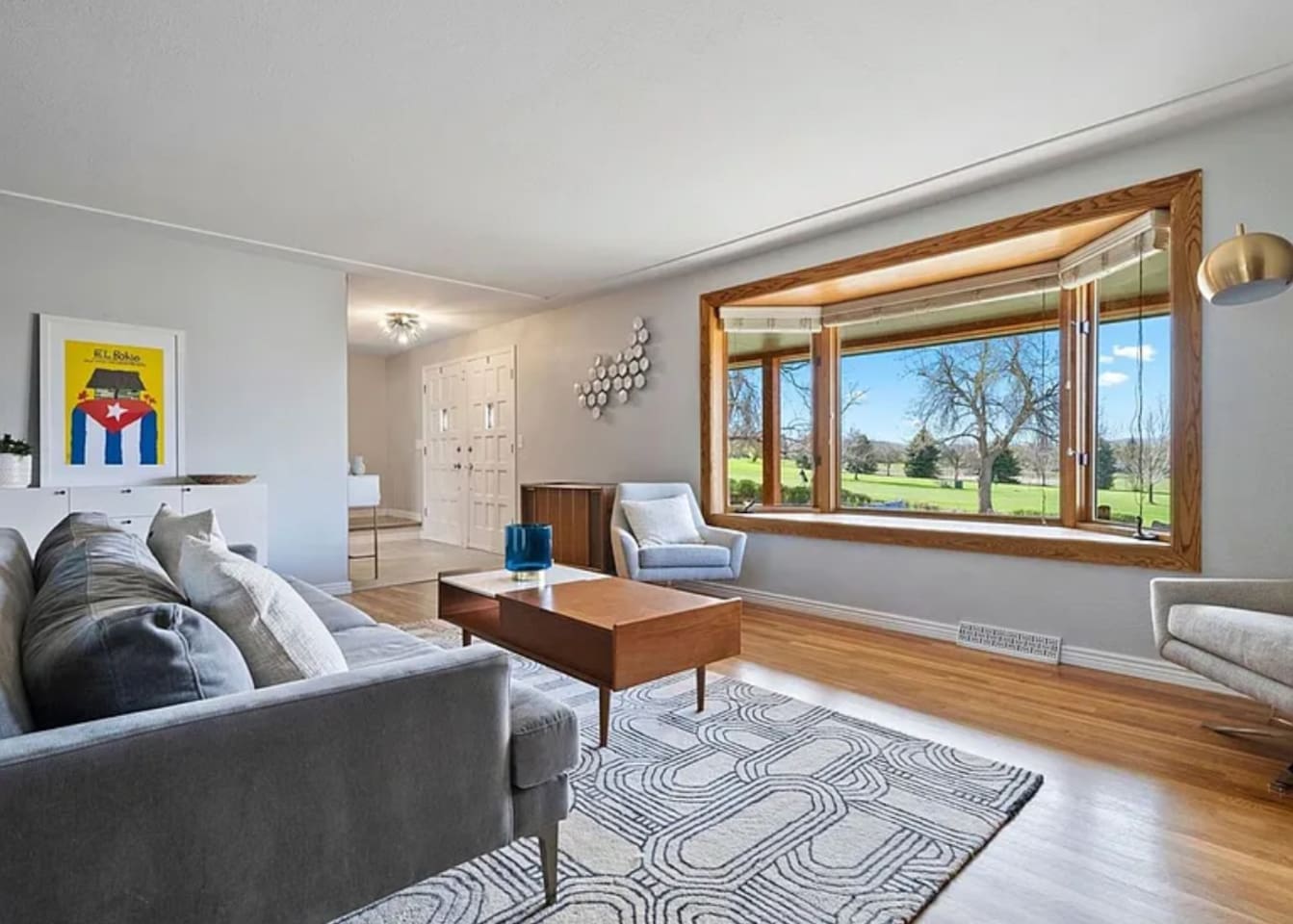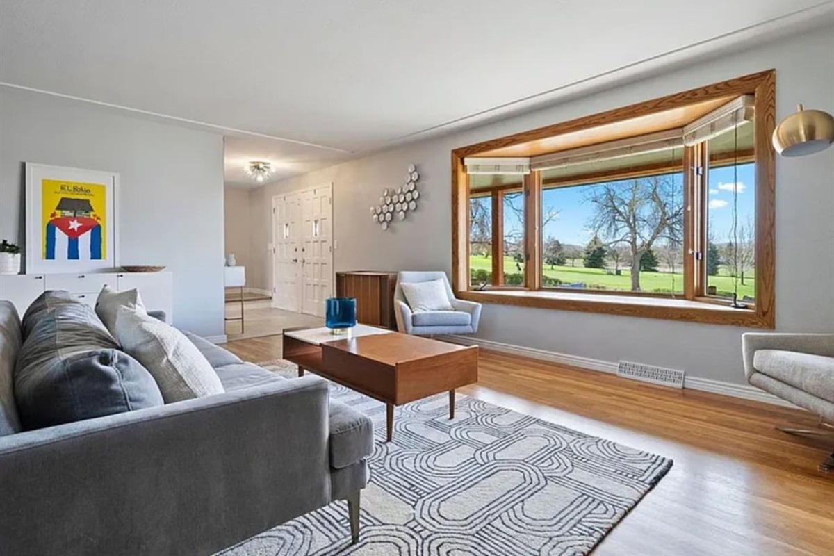 - Living Spaces: Three living rooms, including an expansive living room with a massive bay window showcasing sunsets and mountain and golf course views, and a cozy family room with a fireplace that seamlessly connects to the kitchen.