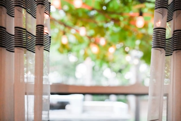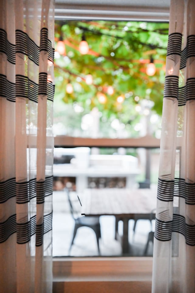 Backyard patio with outdoor kitchen and seating for eight under the twinkle lights
